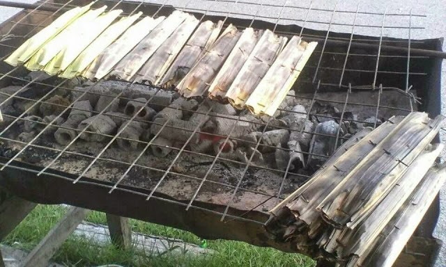 SUMAN PAIS YANG DIPANGGANG DI ATAS PARA. SUMAN PAIS DIPERBUAT DARIPADA LEMANTAK, KELAPA TUA YANG DIPARUT DAN BERINTI MAKANAN LAUT.
